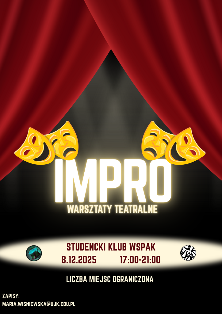 4 grudnia 2025 S.K. WSPAKZapraszamy na warsztaty improwizacji teatralnej według techniki IMPRO Keitha Johnstona. Warsztat jest skierowany nie tylko do osób, które mają styczność ze sceną, ale także do tych, które chciałyby stawiać na niej swoje pierwsze kroki. Jeśli nazwa tej dziedziny niewiele Wam mówi albo kojarzy się ze „Spadkobiercami”, to znacznie lepszym skojarzeniem będzie program „Whose Line Is It Anyway?”: